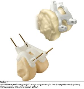 - Οι ολικές αρθροπλαστικές γόνατος, ισχίου, ποδοκνημικής, ακόμη και ώμου, μπορούν να πραγματοποιηθούν με τη χρήση «οδηγών» που είναι εξατομικευμένοι σε κάθε ασθενή [Εικόνα 1].