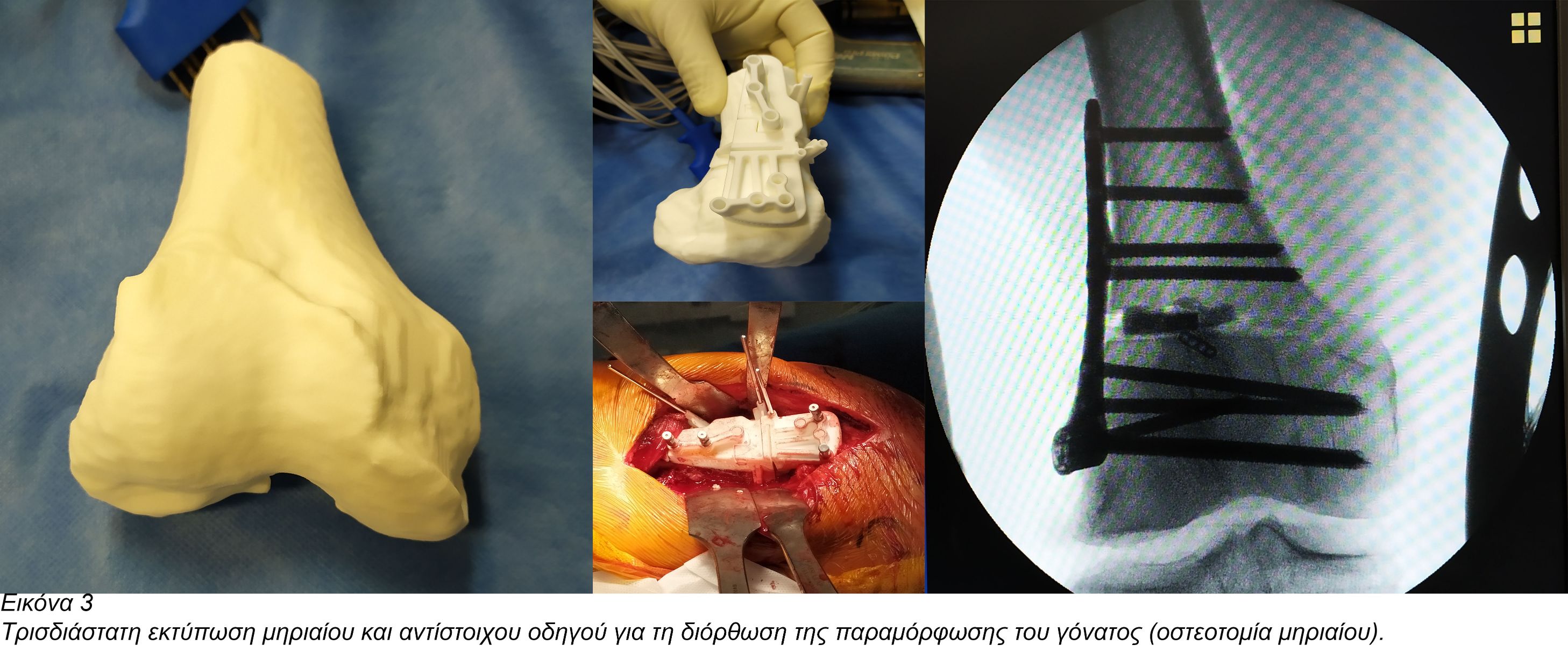 Εφαρμόζουμε πλέον σε πολύπλοκες περιπτώσεις τις δυνατότητες της τρισδιάστατης εκτύπωσης. Παραθέτουμε ένα παράδειγμα παραμόρφωσης γόνατος (βλαισογονία) σε νέο ασθενή λόγω παλαιότερης χειρουργικής επέμβασης. Ο ασθενής υποβλήθηκε σε χαμηλή οστεοτομία μηριαίου [Εικόνα 3].
