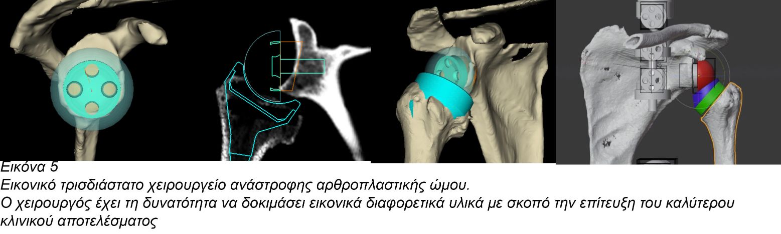 - Μπορεί να πραγματοποηθεί εξ ολοκλήρου η επέμβαση του ασθενή (π.χ. Ολική αρθροπλαστική ώμου) πριν από το πραγματικό χειρουργείο σε εικονικό περιβάλλον. Ο χειρουργός κατανοεί με ακρίβεια την πάθηση του ασθενή και σχεδιάζει τα χειρουργικά βήματα. Αποφασίζονται από πριν τα υλικά που θα χρησιμοποιηθούν και μπορεί ακόμη και να προβλεφθεί το χειρουργικό αποτέλεσμα [Εικόνα 5]