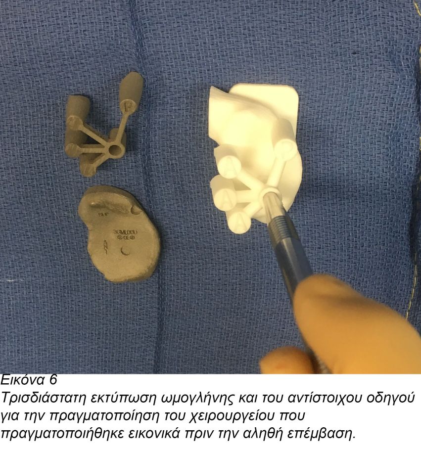 - Στον ίδιο χρόνο μπορούν να εκτυπωθούν τρισδιάστατα οι συγκεκριμένοι «οδηγοί» για να πραγματοποιηθεί το χειρουργείο που σχεδιάστηκε για τον συγκεκριμένο ασθενή [Εικόνα 6]