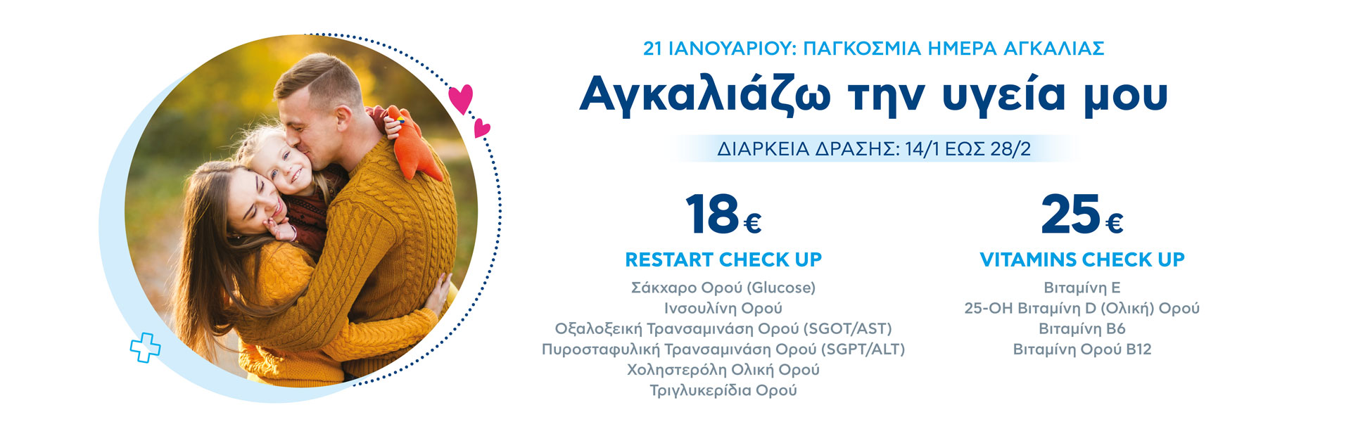 O Όμιλος Εταιρειών Υγείας ΒΙΟΙΑΤΡΙΚΗ με αφορμή την Παγκόσμια Ημέρα Αγκαλιάς (21 Ιανουαρίου) προσφέρει προνομιακά προγράμματα ελέγχου κατάλληλα για κάθε ηλικία με τη δράση “Αγκαλιάζω την Υγεία μου” (Διάρκεια Δράσης 14/1 -28/2/2022).