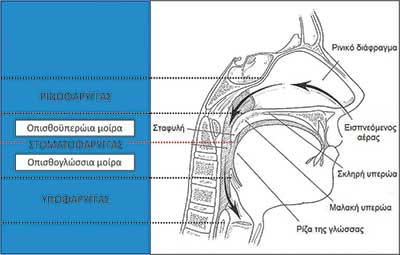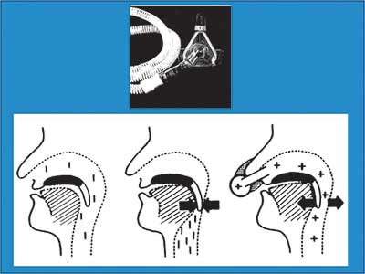 στην παρεµπόδιση της σύµπτωσης (collapse) των ανώτερων αεραγωγών µε διατήρηση της ενδοαυλικής πίεσης πάνω από την κρίσιµη πίεση σύγκλεισης του φάρυγγα – υποφάρυγγα (critical closing airway pressure). Η εφαρµογή της πίεσης µέσω της ρινικής οδού προκαλεί την επαφή της µαλακής υπερώας µε τη βάση της γλώσσας, µε αποτέλεσµα να ελαχιστοποιείται η διαφυγή αέρα από το στόµα (Εικόνα 2).