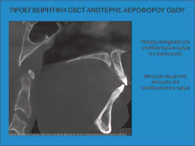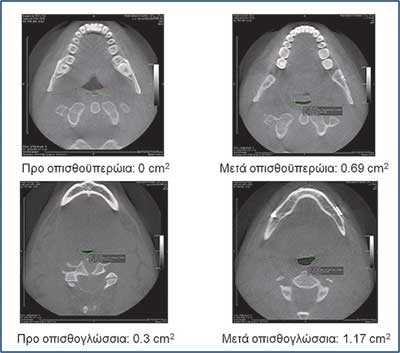 Οι εικόνες 4, 5 και 6 δείχνουν παραδείγµατα ασθενών που υποβλήθηκαν σε αµφιγναθική προώθηση. Στην εικόνα 4 πρόκειται για σύγκριση προεγχειρητικής µε 2 µήνες µετεγχειρητική πλάγια κεφαλοµετρική ακτινογραφία, όπου διακρίνεται η χοανοειδής διεύρυνση του φαρυγγικού αυλού στο οπισθοϋπερώιο και στο οπισθογλώσσιο τµήµα του. Ο συγκεκριµένος ασθενής βελτίωσε τον ∆ΑΥ από τα 100 επεισόδια / ώρα προεγχειρητικά στα 7 επεισόδια / ώρα µετεγχειρητικά, έτσι ώστε να µη χρειάζεται πλέον να κοιµάται µε τη ρινική µάσκα CPAP. Στην εικόνα 5α βλέπουµε µέση οβελιαία τοµή από υπολογιστική τοµογραφία του αεραγωγού ασθενούς µε προεγχειρητικό ∆ΑΥ 55 επεισόδια / ώρα και ελάχιστο καταγεγραµµένο κορεσµό αιµοσφαιρίνης 77%. ∆ιακρίνεται πλήρης οπισθοϋπερώια απόφραξη και πολύ σοβαρή οπισθογλώσσια στένωση. Στηνεικόνα 5β διακρίνεται ο σχεδιασµός της αµφιγναθικής προώθησης και της συµπληρωµατικής οριζόντιας γενειοτοµής στον ίδιο ασθενή. Στην εικόνα 5γπαρατίθεται η σύγκριση του εµβαδού διατοµής του φαρυγγικού αυλού αυτού του ασθενούς οπισθοϋπερώια και οπισθογλώσσια πριν και 1 έτος µετά την επέµβαση. Είναι εµφανέστατη η αύξηση των διαστάσεων του αεραγωγού. Οι εικόνες 6α και 6β αποτελούν πλάγιες και κατά µέτωπο τρισδιάστατες απεικονίσεις αεραγωγού ασθενούς πάσχοντος από βαρύτατο ΣΑΑΥ προ και µετά την αµφιγναθική προώθηση.