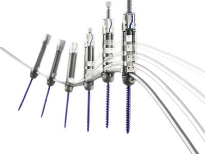 Χρησιµοποιώντας παραπλήσια τεχνική, δηλαδή µε τη διύνηση των ιστών και όχι µε το κόψιµο ή το κάψιµό τους, είναι δυνατή και η πραγµατοποίηση της σταθεροποίησης της σπονδυλικής στήλης, δηλαδή της σπονδυλοδεσίας. Η τεχνική αυτή ονοµάζεται διαδερµικήσπονδυλοδεσία. Ανέκαθεν ο όρος «σπονδυλοδεσία» προκαλούσε ρίγη δέους στους επαγγελµατίες υγείας και σκιρτήµατα φόβου στους ασθενείς. Ο λόγος είναι ότι για την πραγµατοποίηση ήταν απαραίτητη µια µεγάλη σε µήκος τοµή, που συνοδεύεται απαραίτητα από εκτεταµένη αποκόλληση των παρασπονδυλικών µυών. Με τον τρόπο αυτό, παρά τη σταθεροποίηση της σπονδυλικής στήλης µε βίδες και ράβδους, το µυϊκό σύστηµα αποδυναµώνεται, µε αποτέλεσµα να εµφανίζονται πόνοι άτυπης αιτιολογίας, όπως, π.χ., ο χρόνιος νευροπαθητικός πόνος. Παράλληλα, χάνεται και σηµαντική ποσότητα αίµατος, γεγονός που καθιστά το χειρουργείο απαγορευτικό για εξασθενηµένους ή ηλικιωµένους ασθενείς (Εικόνα 3).