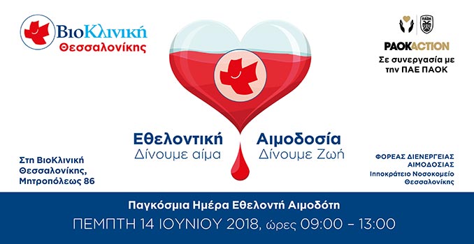 Η Βιοκλινική Θεσσαλονίκης, με τη συνεργασία της ΠΑΕ ΠΑΟΚ (PAOK Action) διοργανώνει ΕΘΕΛΟΝΤΙΚΗ ΑΙΜΟΔΟΣΙΑ στις εγκαταστάσεις της