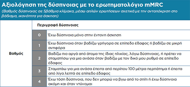 Στα κριτήρια ταξινόµησης των ασθενών σε θεραπευτική αγωγή, εκτός της σπιροµέτρησης, λαµβάνονται υπ’ όψιν το ιστορικό των παροξύνσεων του ασθενούς, η βαθµονόµηση της δύσπνοιας (σύµφωνα µε την τροποποιηµένη κλίµακα MRC, Medical Research Council), καθώς και η βαθµονόµηση των συµπτωµάτων, σύµφωνα µε το τεστ αξιολόγησης CAT (Copd Assessment Test).