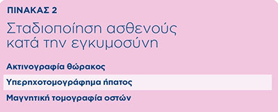 Ο καρκίνος του µαστού µεθίσταται συχνότερα στους πνεύµονες, στο ήπαρ και τα οστά. Πολλές γυναίκες µε ΚΜΣΚ τη στιγµή της διάγνωσης βρίσκονται σε προχωρηµένο στάδιο. Η σταδιοποίηση της νόσου διαφοροποιείται στις γυναίκες αυτές, µε στόχο την προστασία του εµβρύου. Η αξιολόγηση των µεταστάσεων κατά την εγκυµοσύνη γίνεται µε ακτινογραφία θώρακος (εφαρµόζεται ασπίδα προστασίας της κοιλιακής χώρας και της πυέλου), υπερηχοτοµογράφηµα ήπατος και µαγνητική τοµογραφία οστών, χωρίς την ενδοφλέβια χορήγηση παραµαγνητικής ουσίας (Πίνακας 2).