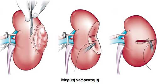 Η επέμβαση μπορεί να αφορά στην αφαίρεση ολόκληρου του νεφρού (ριζική νεφρεκτομή) ή σε κάποιες περιπτώσεις συντηρητικότερη χειρουργική με διατήρηση μέρους του νεφρού(μερική νεφρεκτομή).